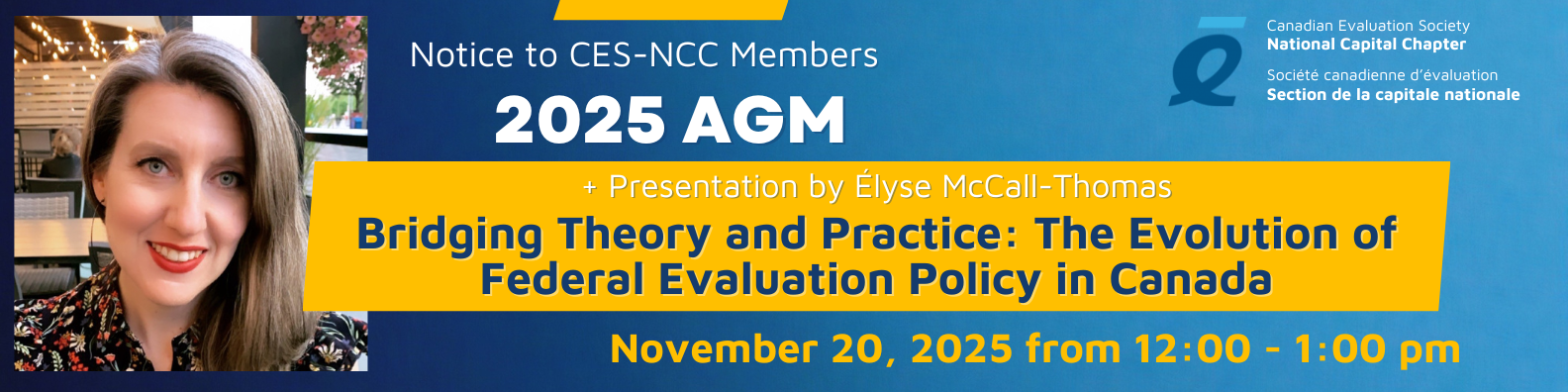 ** We appreciate how busy everyone is, so for members who attend the AGM (we are hoping to keep it to 15-20 minutes) we are including an exclusive presentation with University of Ottawa PhD candidate Élyse McCall-Thomas on Bridging Theory and Practice: The Evolution of Federal Evaluation Policy in Canada.