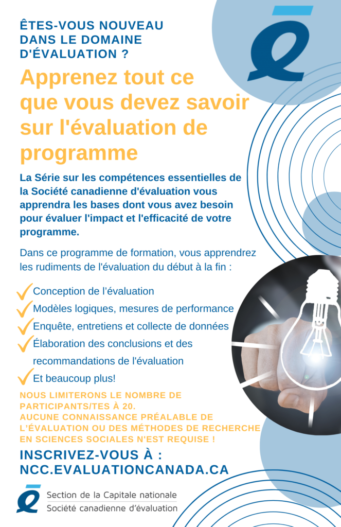 Ce cours s’adresse principalement aux nouveaux venus dans le domaine de l’évaluation, et ne requiert aucune connaissance préalable de l’évaluation ou des méthodes de recherche en sciences sociales. Au terme de leur formation, les participants à ce cours d’une durée de quatre jours seront bien outillés pour faire leurs premiers pas dans ce secteur et y progresser en vue de devenir des professionnels de l’évaluation. Les diplômés passeront sommairement en revue les 28 principaux concepts de l’évaluation, qu’il s’agisse de l’utilisation et des avantages de l’évaluation grâce aux méthodes de collecte de données, ou encore des normes et des principes d’éthique dans ce domaine. Ils auront aussi l’occasion d’acquérir de l’expérience de base à l’égard de six grands volets de la pratique, de la conception de modèles logiques jusqu’à la rédaction de comptes-rendus.